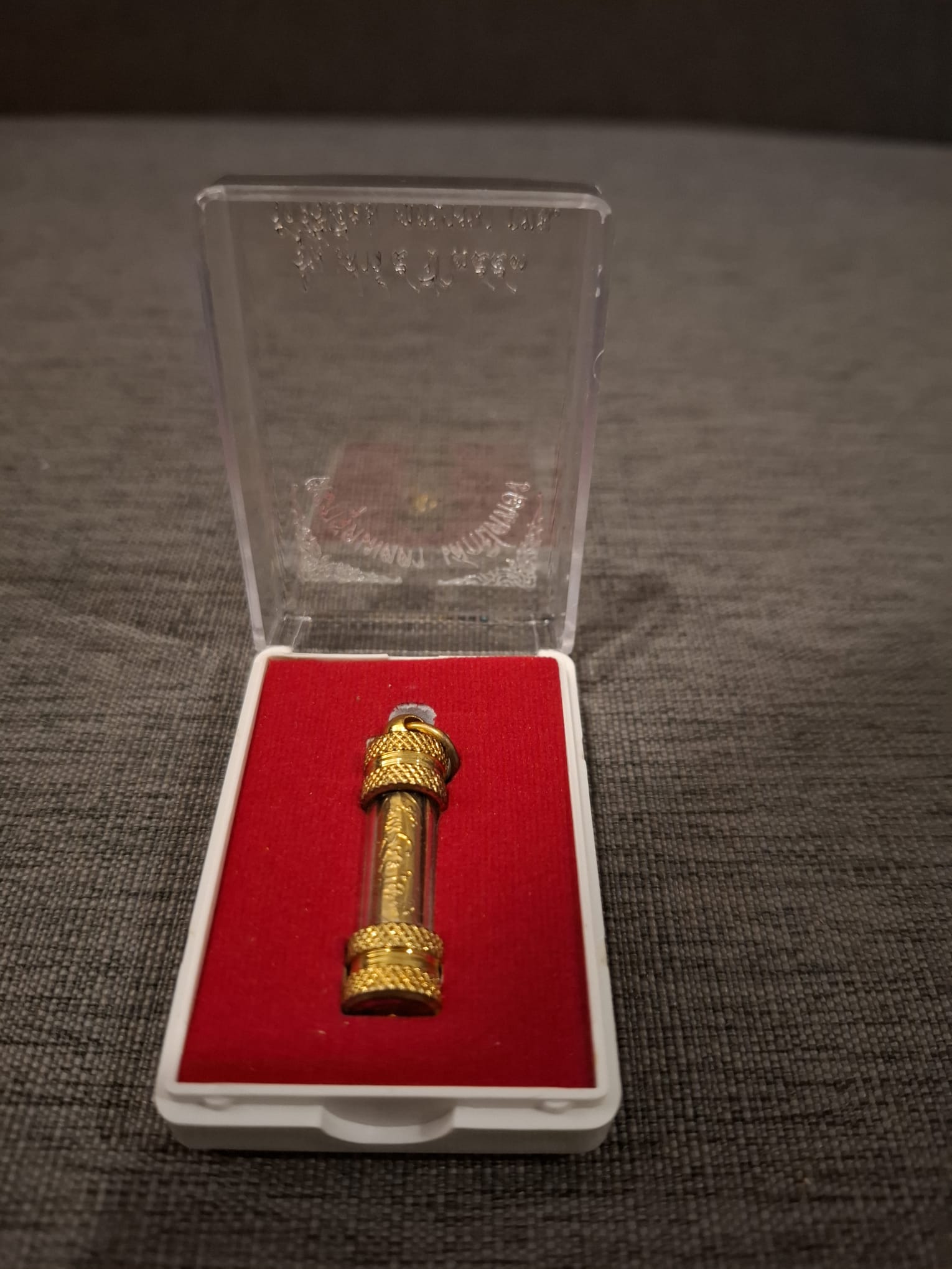 It is a traditional Thai tubular amulet, inscribed with sacred symbols or mantras, believed to offer the wearer protection, strength, and resilience in the ring.